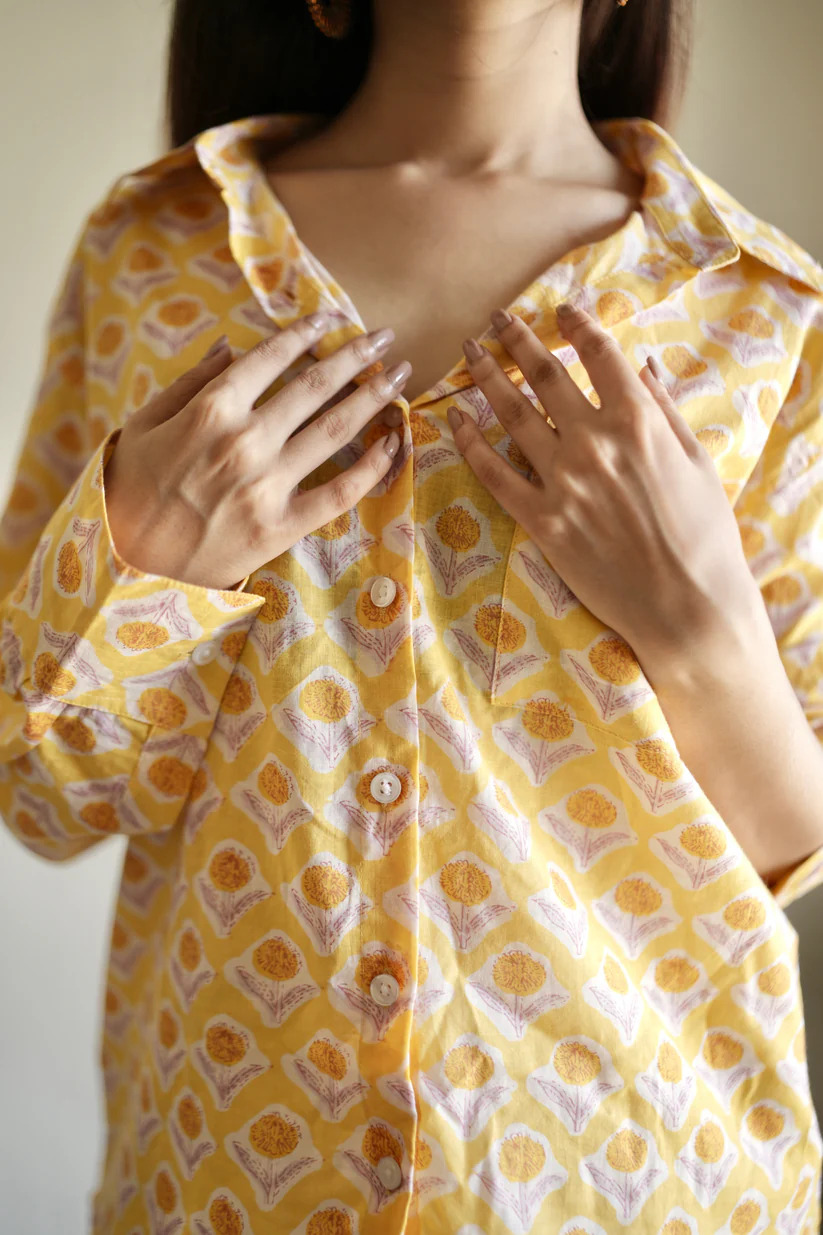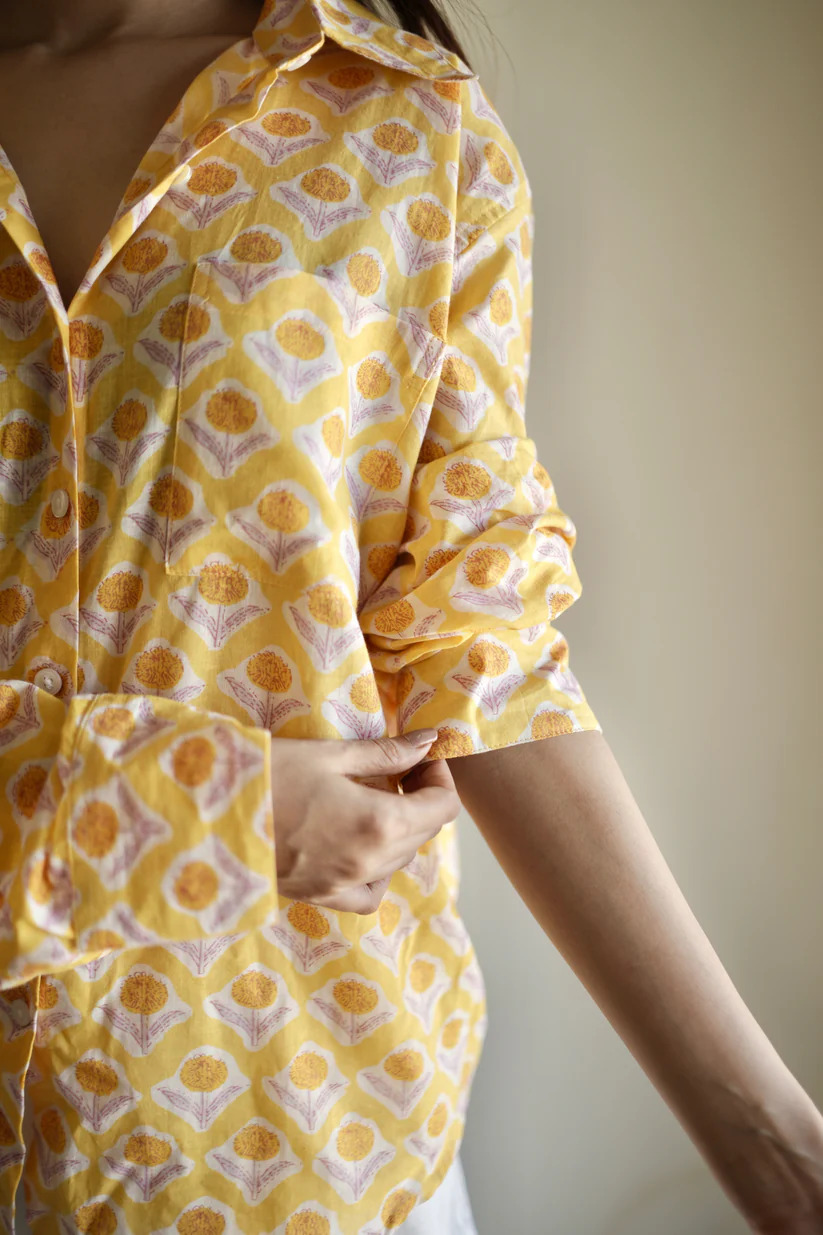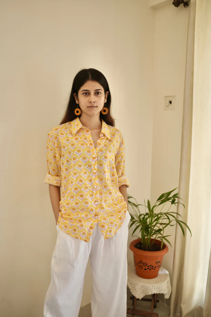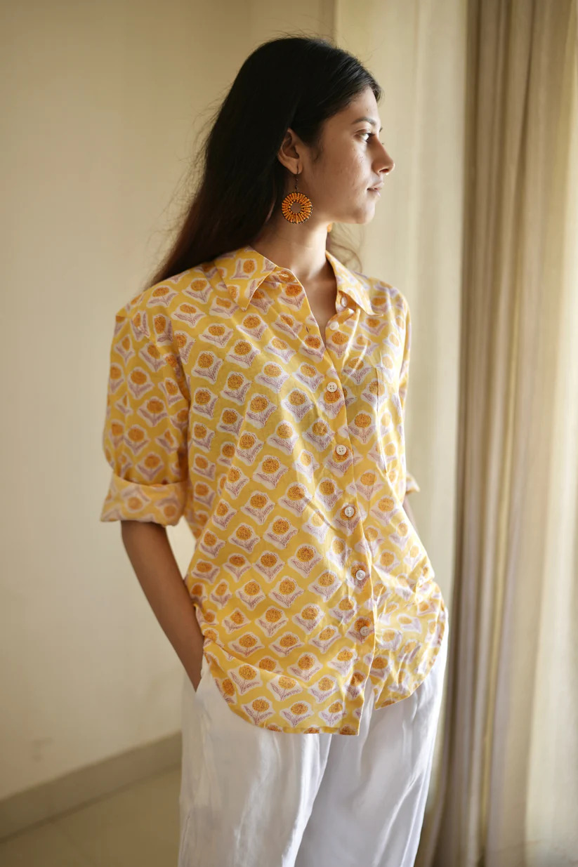 Bring a touch of sunshine to your wardrobe with our Golden hour shirt, crafted for both comfort and style. Featuring a warm yellow base adorned with intricate hand-block floral motifs in soft orange and white, this shirt embodies effortless elegance. The breathable cotton fabric, button-down front, and roll-up sleeves make it perfect for all-day wear in any season. Pair it with white trousers, denim, or shorts for a relaxed yet polished look, ideal for casual outings, vacations, or everyday wear.