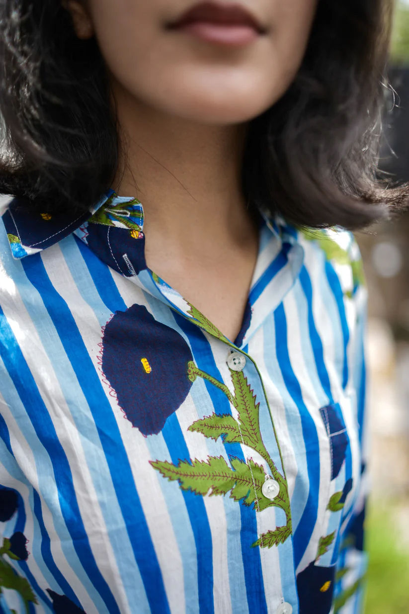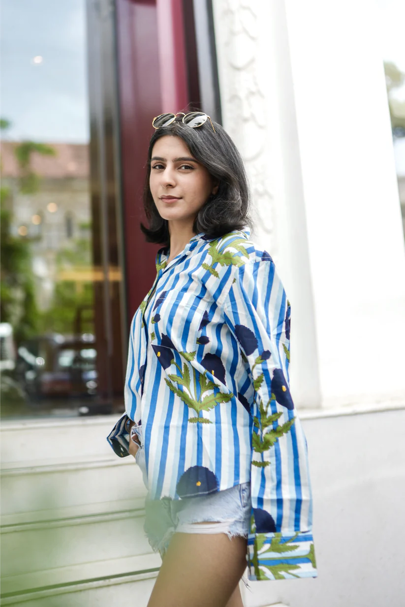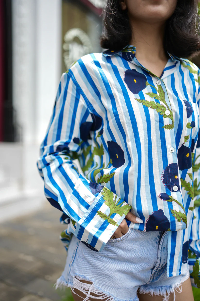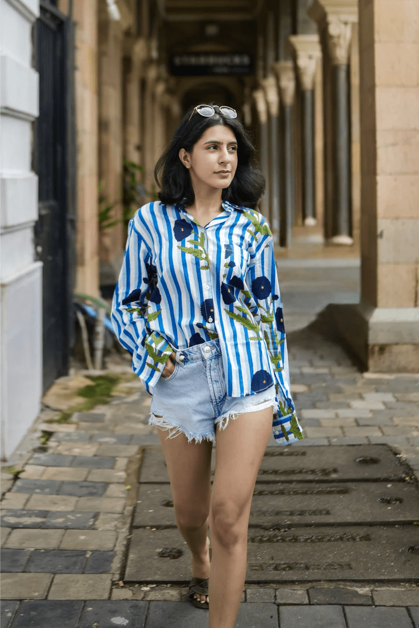 The Indigo Bloom Shirt is easy to style—tuck it into your denims, pair with shorts for a casual day out, or layer over a dress for a playful twist. Lightweight and versatile, it’s your go-to shirt for brunches, travel, or just strolling around the city in comfort.